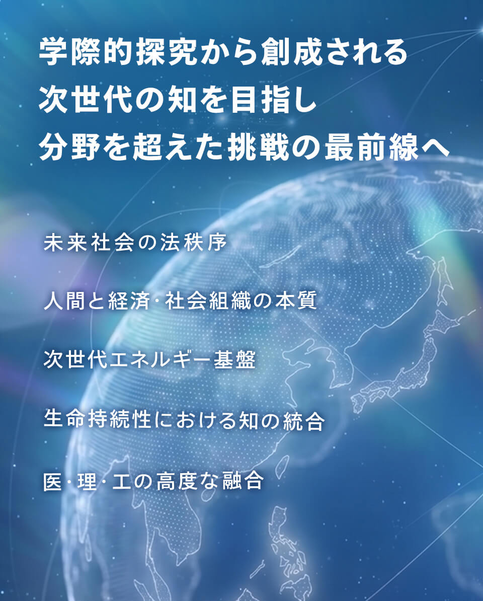 学際創成学術院は、単独の学問分野では解決できない地球規模課題に挑み、学問の壁を超えた知の統合と社会実装を推進します。